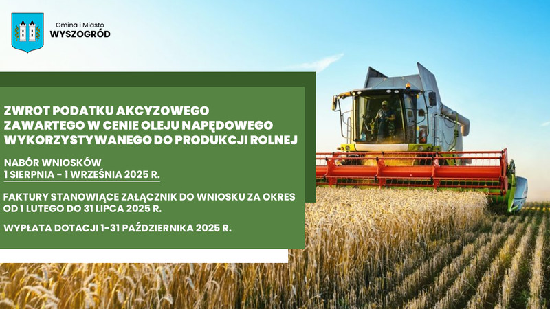 W 2025 roku posiadacze gospodarstw rolnych położonych na terenie naszej gminy, mogą składać wnioski o zwrot podatku akcyzowego za zakup oleju napędowego wykorzystywanego do produkcji rolnej do Urzędu Gminy i Miasta Wyszogród aktualnie w II terminie: